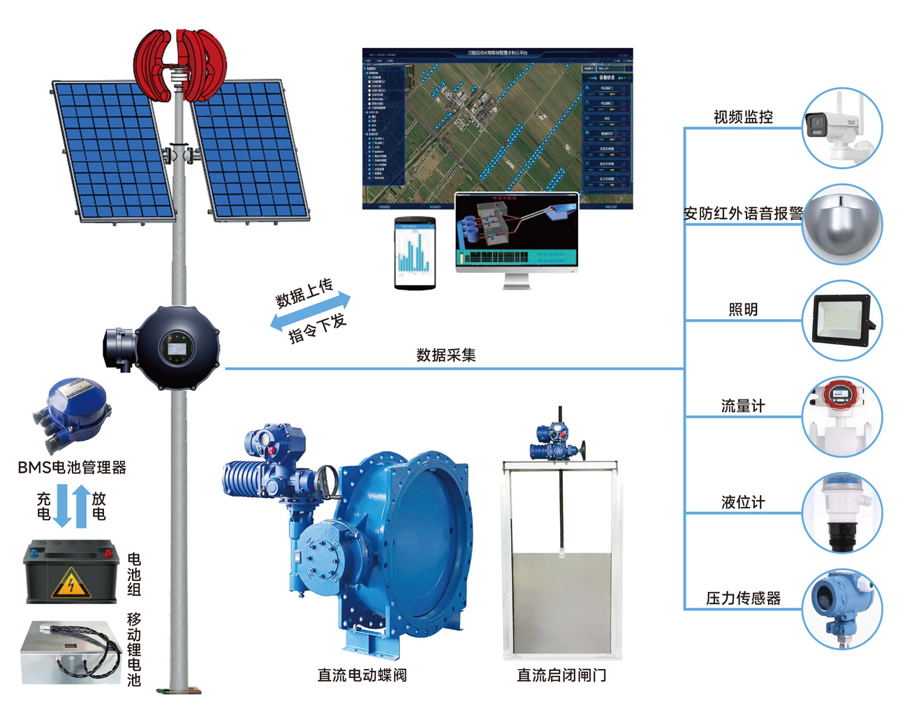 由太陽(yáng)能光伏板和小型風(fēng)力發(fā)電機(jī)為蓄能電池組充電,電池組有BMS電池管理軟件管控,為永磁無刷直流電機(jī)的各類驅(qū)動(dòng)裝置供電,同時(shí)為視頻監(jiān)控,壓力、流量、液位傳感器,照明等供電